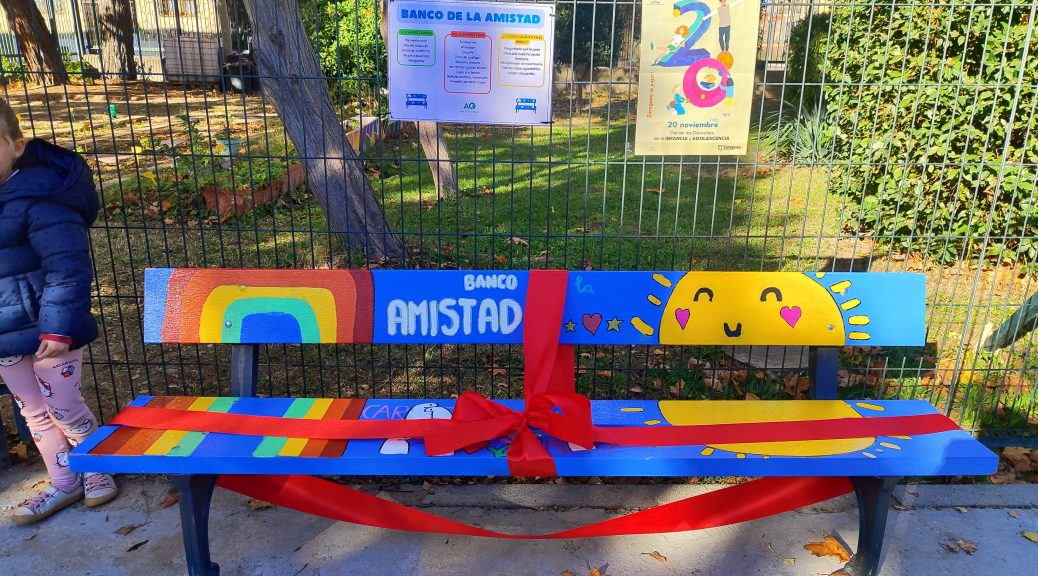 El 20 de Noviembre, con motivo del Día Mundial de la Infancia, inauguramos oficialmente nuestros bancos de la amistad en los patios de Infantil y Primaria. Estos bancos fueron solicitados por los niños y niñas del cole en las asambleas de convivencia; y finalmente, el curso pasado, los pintamos y decoramos al gusto de todos. Para su inauguración oficial, se repasaron en las aulas el por qué y para qué de estos bancos y recordamos cómo hacer un buen uso….