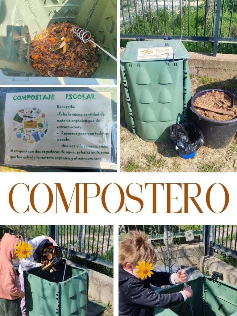 Cada aula dispone de su propia papelera de residuos orgánicos, que después llevamos al compostero. Allí seguimos un proceso muy sencillo pero fundamental: